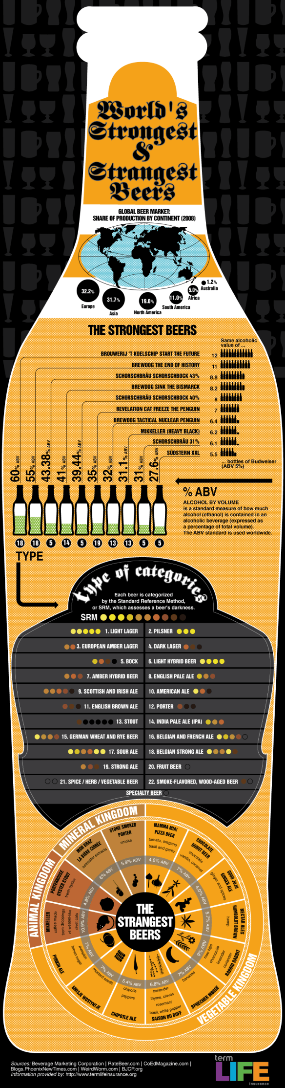 Por eso, acá les compartimos una gráfica de la publicación electrónica Term Life Insurance (Sí, el nombre de este sitio tampoco hace mucho sentido con el tema cervecero)  donde pone de manifiesto algunas cifras sobre las cervezas con más contenido de alcohol, así como otras tantas con orígenes raros en sus recetas.
