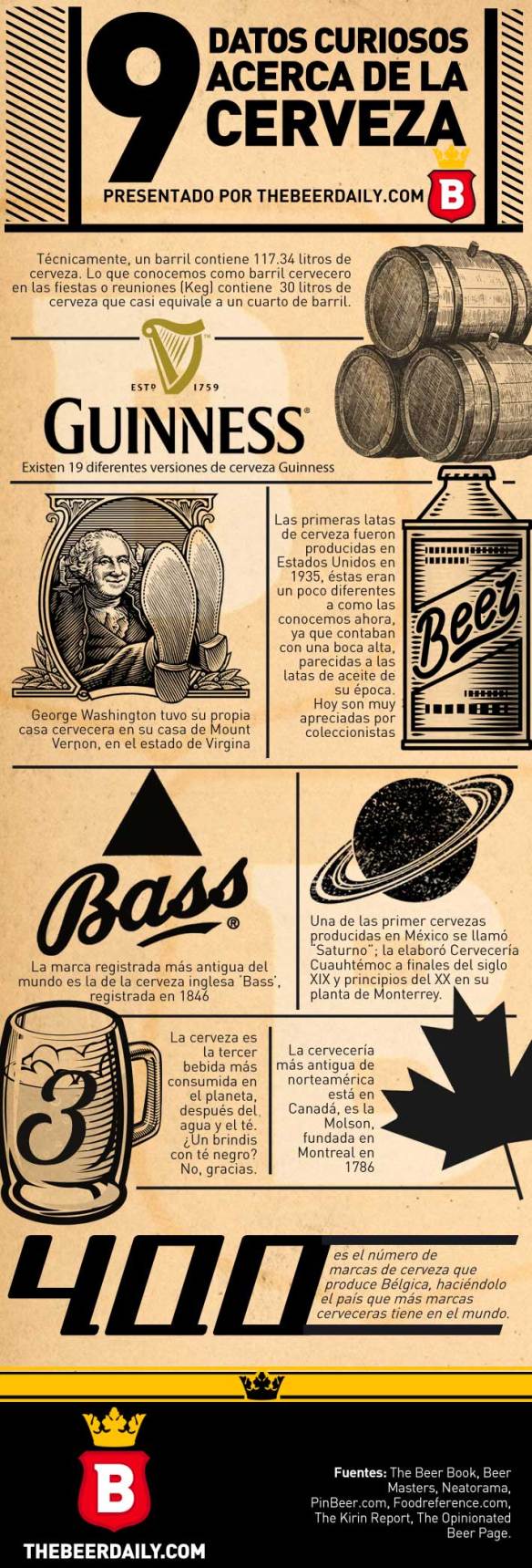 En esta ocasión les presentamos otra de las infografías elaboradas por el Staff de The Beer Daily, con 9 datos curiosos acerca de la cerveza, que seguramente muchos no conozcan, como cuántas marcas de cerveza produce Bélgica o qué planeta del sistema solar eligió una de las principales cervecerías del país para bautizar a uno de sus productos en el siglo XIX…en fin, que la disfruten.