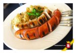 De entrada, nos decidimos por probar un queso Camembert empanizado servido sobre un espejo de arándanos (Panierter Camembert mit Preiselbeeren), el cual es una delicia, y aunque su nombre sea medio apantallador, la realidad es que es un platillo sencillo y que va bastante bien con las HB´s que tomamos.  Después del queso de entrada y viendo que queríamos probar platillos básicos alemanes,  el Capitán nos sirvió un plato mixto de Würstchen (salchichas) en las que combinan las del tipo Nürnberger, Frankfurter y la Weiße Bratwurst (salchicha blanca de ternera); estas salchichas asadas vienen acompañadas con papa estilo Munich y Sauerkraut.