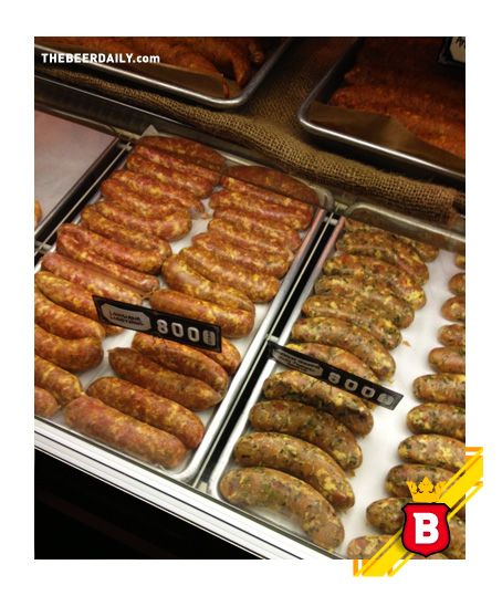 Lo que si está para pedir una y otra vez son sus salchichas, las cuales tienen en muchas variedades, desde las clásicas bratwurst hasta algunas “exóticas” -como ellos les llaman- como la de pato, higo y tocino, y la de carne de lagarto, e incluso hasta variedades vegetarianas como las de espárragos y champiñones ahumados y las que queso de cabra y betabel. Acá la decisión es igual de difícil que con la elección de las cervezas, ya que manejan más de 30 tipos de salchichas, por lo que está vez nos fuimos por lo más básico, pidiendo una Bratwurst y una Andouille que es una salchicha de cerdo con especias, vino y cebollas; ambas las acompañamos con pan de centeno y estaban deliciosas, sobre todo con un poco de mostaza agria de la casa, la cual tiene bastante kick, por eso si visitas este lugar y pides mostaza, vete con precaución, ya que es de un sabor bastante intenso.