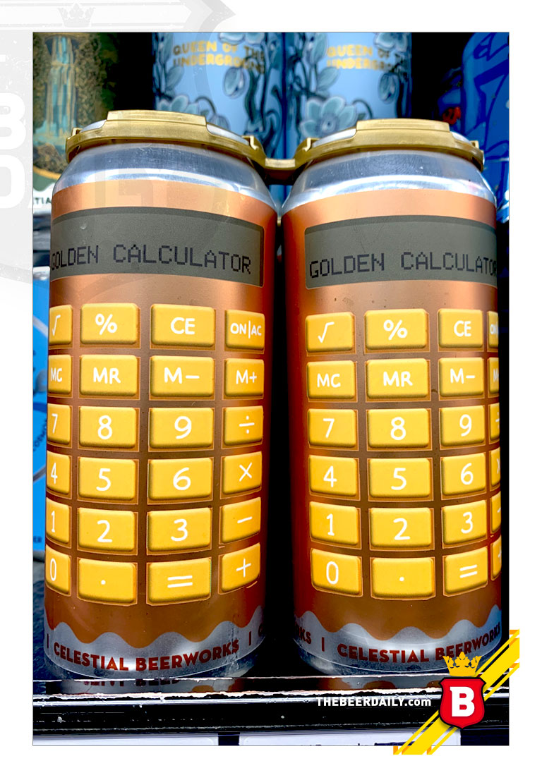 Esta cheve se llama Golden Calculator, y es una cerveza estilo Imperial IPA de 8.5 % ABV, de robustez media, de color dorado, con ligeras notas a durazno y piña, con amargor notable al pasar el trago. ¿Está buena? Sí, muy en el estilo de esas IPA, pero sin duda lo más llamativo de esta cerveza es su empaque, que llama mucho la atención en los anaqueles en los que está.