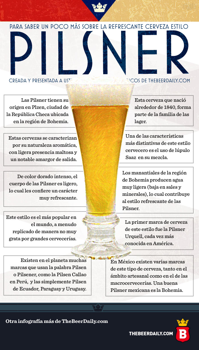 ¿Has escuchado hablar de la Pilsner? Seguro que sí, y es que este estilo de cerveza también conocida como Pilsen o Pilsener es uno de los más populares del planeta, por ello, era algo así como sacrilegio que no publicáramos una infografía dedicada a esta dorada y refrescante cerveza de origen centroeuropeo. Por eso, hoy en TheBeerDaily.com te compartimos esta imagen, ojalá que la disfrutes.